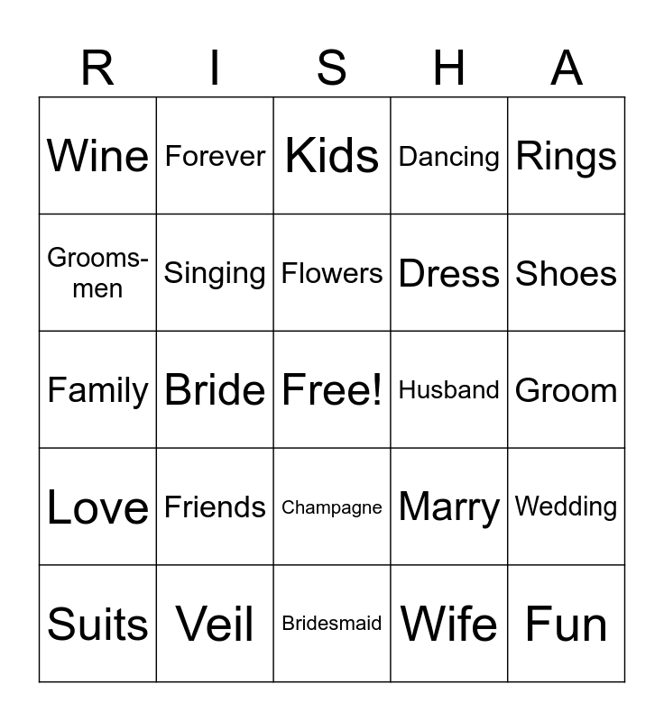 This bingo card has a free space and 24 words: Friends, Veil, Flowers, Suits, Rings, Wine, Grooms-men, Forever, Husband, Champagne, Dress, Family, Marry, Wedding, Singing, Wife, Groom, Kids, Shoes, Bride, Fun, Love, Dancing and Bridesmaid.