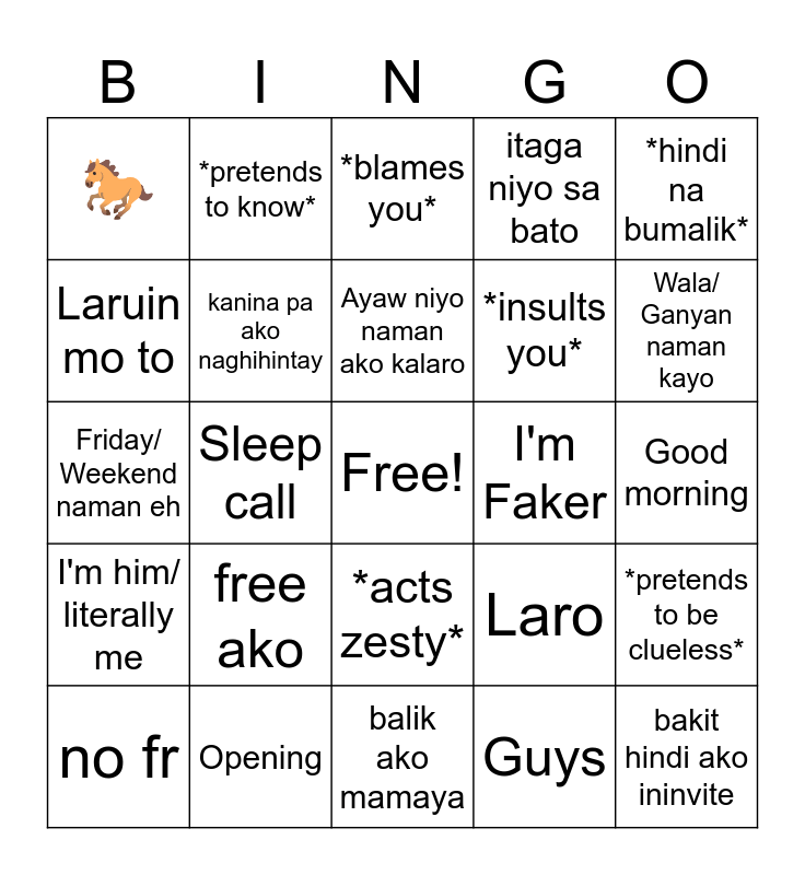 This bingo card has a free space and 24 words: free ako, Opening, Ayaw niyo naman ako kalaro, no fr, *hindi na bumalik*, 🐎, Laruin mo to, *pretends to know*, I'm Faker, *acts zesty*, *insults you*, Friday/ Weekend naman eh, Laro, *pretends to be clueless*, kanina pa ako naghihintay, Guys, Good morning, *blames you*, Wala/ Ganyan naman kayo, Sleep call, bakit hindi ako ininvite, I'm him/ literally me, itaga niyo sa bato and balik ako mamaya.