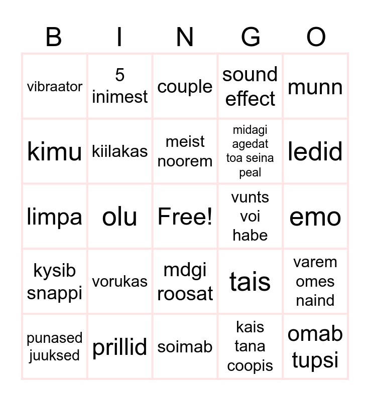 This bingo card has a free space and 24 words: vorukas, prillid, meist noorem, punased juuksed, munn, vibraator, kimu, 5 inimest, vunts voi habe, mdgi roosat, midagi agedat toa seina peal, limpa, tais, varem omes naind, kiilakas, kais tana coopis, emo, couple, ledid, olu, omab tupsi, kysib snappi, sound effect and soimab.