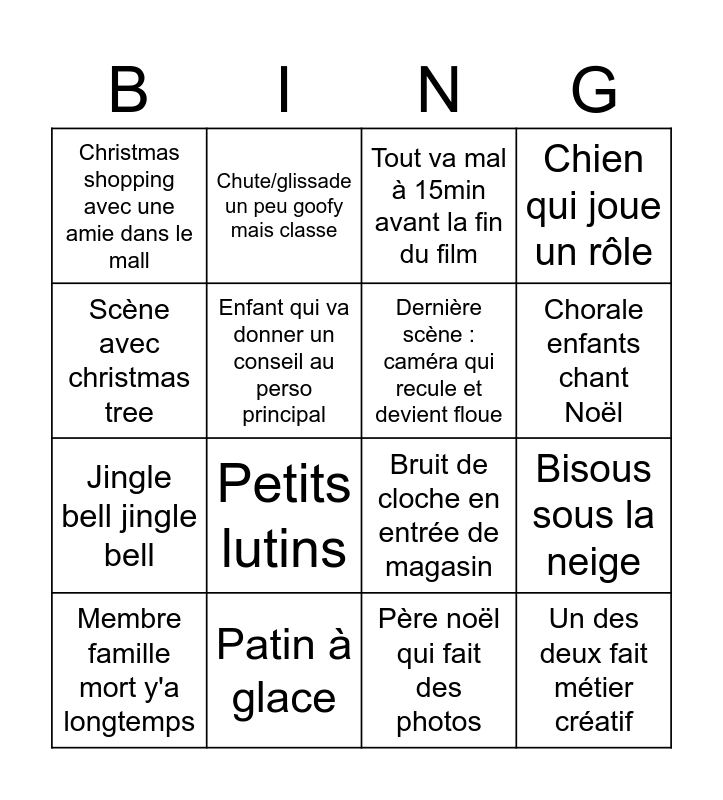 This bingo card has 16 words: Patin à glace, Bisous sous la neige, Tout va mal à 15min avant la fin du film, Christmas shopping avec une amie dans le mall, Jingle bell jingle bell, Chute/glissade un peu goofy mais classe, Bruit de cloche en entrée de magasin, Père noël qui fait des photos, Scène avec christmas tree, Enfant qui va donner un conseil au perso principal, Membre famille mort y'a longtemps, Chien qui joue un rôle, Petits lutins, Chorale enfants chant Noël, Dernière scène : caméra qui recule et devient floue and Un des deux fait métier créatif.