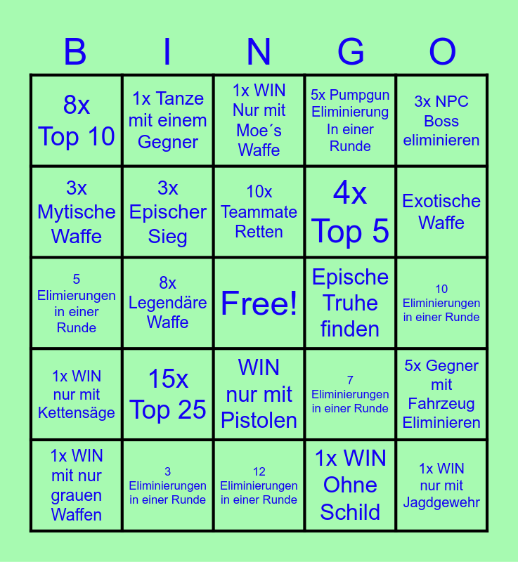This bingo card has a free space and 24 words: 15x Top 25, 3 Eliminierungen in einer Runde, 10x Teammate Retten, 1x WIN mit nur grauen Waffen, 3x NPC Boss eliminieren, 8x Top 10, 3x Mytische Waffe, 1x Tanze mit einem Gegner, Epische Truhe finden, WIN nur mit Pistolen, 4x Top 5, 5 Elimierungen in einer Runde, 7 Eliminierungen in einer Runde, 5x Gegner mit Fahrzeug Eliminieren, 3x Epischer Sieg, 1x WIN Ohne Schild, 10 Eliminierungen in einer Runde, 1x WIN Nur mit Moe´s Waffe, Exotische Waffe, 8x Legendäre Waffe, 1x WIN nur mit Jagdgewehr, 1x WIN nur mit Kettensäge, 5x Pumpgun Eliminierung In einer Runde and 12 Eliminierungen in einer Runde.