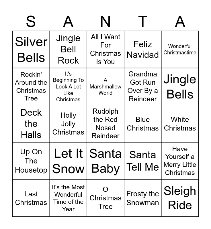 This bingo card has a free space and 26 words: Santa Baby, Frosty the Snowman, A Marshmallow World, It's the Most Wonderful Time of the Year, Wonderful Christmastime, Silver Bells, Rockin' Around the Christmas Tree, Jingle Bell Rock, White Christmas, Santa Tell Me, Grandma Got Run Over By a Reindeer, Deck the Halls, Have Yourself a Merry Little Christmas, Last Christmas, Holly Jolly Christmas, Baby It's Cold Outside, Feliz Navidad, Up On The Housetop, All I Want For Christmas Is You, Sleigh Ride, Jingle Bells, O Christmas Tree, Blue Christmas, Let It Snow, It's Beginning To Look A Lot Like Christmas and Winter Wonderland.