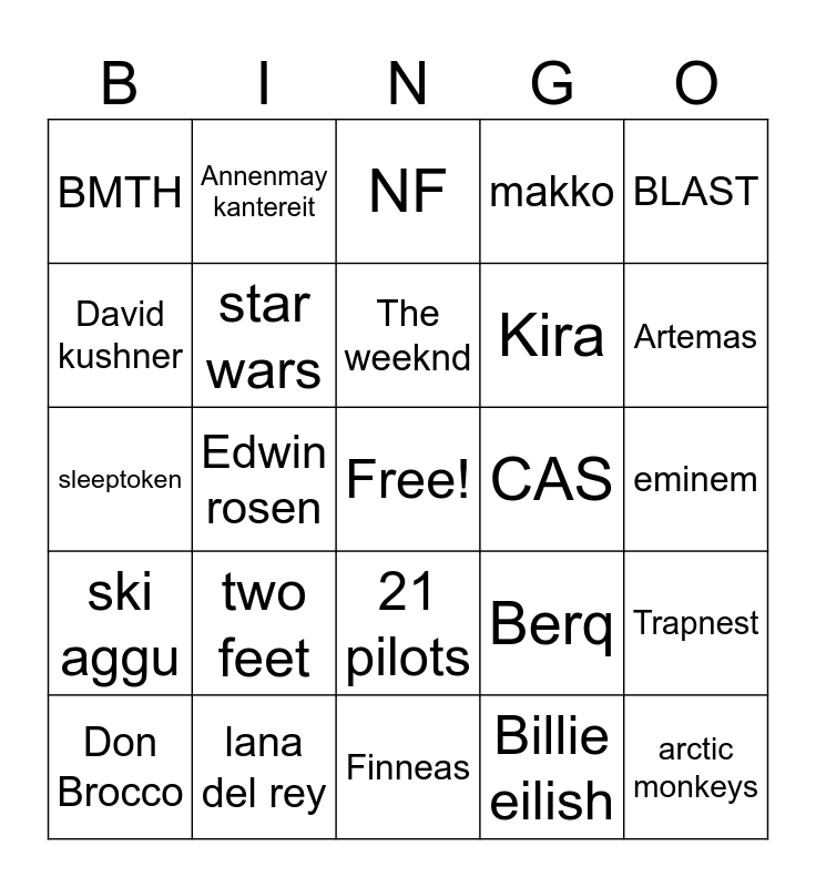 This bingo card has a free space and 24 words: two feet, lana del rey, The weeknd, Don Brocco, BLAST, BMTH, David kushner, Annenmay kantereit, CAS, 21 pilots, Kira, sleeptoken, Berq, Trapnest, star wars, Billie eilish, eminem, NF, Artemas, Edwin rosen, arctic monkeys, ski aggu, makko and Finneas.