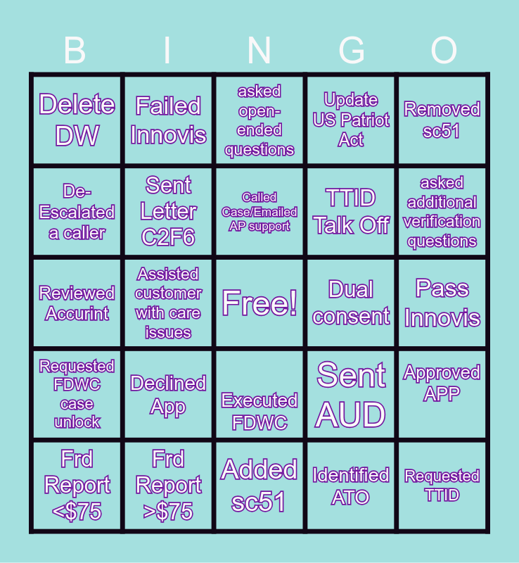 This bingo card has a free space and 24 words: Declined App, Frd Report >$75, Called Case/Emailed AP support, Frd Report <$75, Removed sc51, Delete DW, De-Escalated a caller, Failed Innovis, Dual consent, Executed FDWC, TTID Talk Off, Reviewed Accurint, Sent AUD, Approved APP, Sent Letter C2F6, Identified ATO, Pass Innovis, asked open-ended questions, asked additional verification questions, Assisted customer with care issues, Requested TTID, Requested FDWC case unlock, Update US Patriot Act and Added sc51.