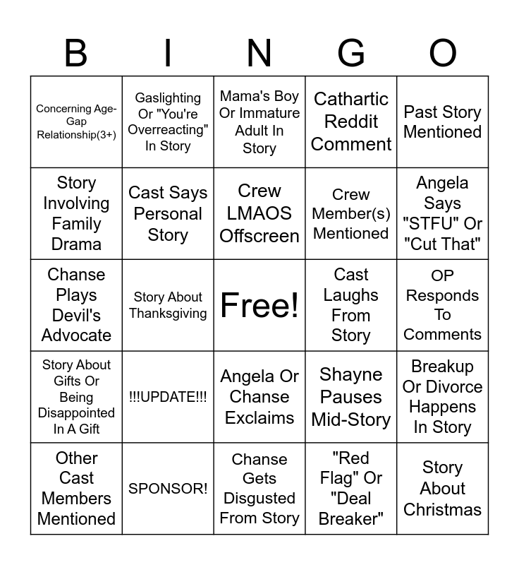 This bingo card has a free space and 24 words: !!!UPDATE!!!, SPONSOR!, Crew LMAOS Offscreen, Other Cast Members Mentioned, Past Story Mentioned, Concerning Age-Gap Relationship(3+), Story Involving Family Drama, Gaslighting Or "You're Overreacting" In Story, Cast Laughs From Story, Angela Or Chanse Exclaims, Crew Member(s) Mentioned, Chanse Plays Devil's Advocate, Shayne Pauses Mid-Story, Breakup Or Divorce Happens In Story, Cast Says Personal Story, "Red Flag" Or "Deal Breaker", OP Responds To Comments, Mama's Boy Or Immature Adult In Story, Angela Says "STFU" Or "Cut That", Story About Thanksgiving, Story About Christmas, Story About Gifts Or Being Disappointed In A Gift, Cathartic Reddit Comment and Chanse Gets Disgusted From Story.