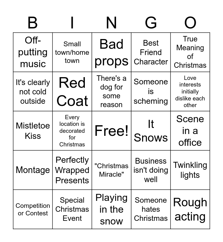 This bingo card has a free space and 34 words: This is just in a house, Someone hates Christmas, Plaid, Workaholic Character, Montage, Red Coat, True Meaning of Christmas, Competition or Contest, Small town/home town, awkward silence, There's a dog for some reason, Bad props, Christmas Sweaters, Dead Parent, It Snows, Love interests initially dislike each other, Special Christmas Event, Mistletoe Kiss, Perfectly Wrapped Presents, Business isn't doing well, "Christmas Miracle", Baking Scene, Off- putting music, Scene in a office, Playing in the snow, Rough acting, Best Friend Character, Family Business, Someone is scheming, It's clearly not cold outside, Hot Cocoa or Eggnog, Every location is decorated for Christmas, Twinkling lights and Inhuman Dialogue.