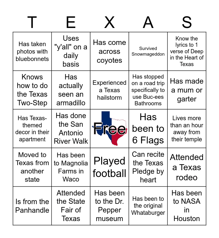 This bingo card has a free space and 35 words: Summited Guadalupe Peak, Has seen the Texas State Capitol Building, Was born and raised in Texas, Has actually seen an armadillo, Played football, Survived Snowmageddon, Knows how to do the Texas Two-Step, Has gone to the Alamo, Experienced a Texas hailstorm, Has been to Big Bend National Park, Has Texas-themed decor in their apartment, Know the lyrics to 1 verse of Deep in the Heart of Texas, Has visited Buc-ees, Marched in a marching band, Has taken photos with bluebonnets, Has been to 6 Flags, Has been to the original Whataburger, Has done the San Antonio River Walk, Moved to Texas from another state, Has been to NASA in Houston, Can recite the Texas Pledge by heart, Is from the Panhandle, Attended a Texas rodeo, Attended the State Fair of Texas, Has come across coyotes, Has made a mum or garter, Has encountered a rattlesnake, Has been to Braum's, Has stopped on a road trip specifically to use Buc-ees Bathrooms, Lives more than an hour away from their temple, Has been to Cadillac Ranch, Has been to the Dr. Pepper museum, Has been to Magnolia Farms in Waco, Uses "y'all" on a daily basis and Owns a Texas flag.