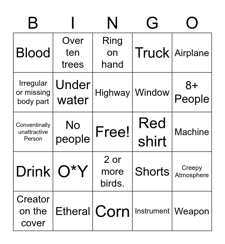 This bingo card has a free space and 24 words: O*Y, Etheral, Highway, Creator on the cover, Airplane, Blood, Irregular or missing body part, Over ten trees, Red shirt, 2 or more birds., Window, Conventinally unattractive Person, Shorts, Creepy Atmosphere, Under water, Instrument, Machine, Ring on hand, 8+ People, No people, Weapon, Drink, Truck and Corn.