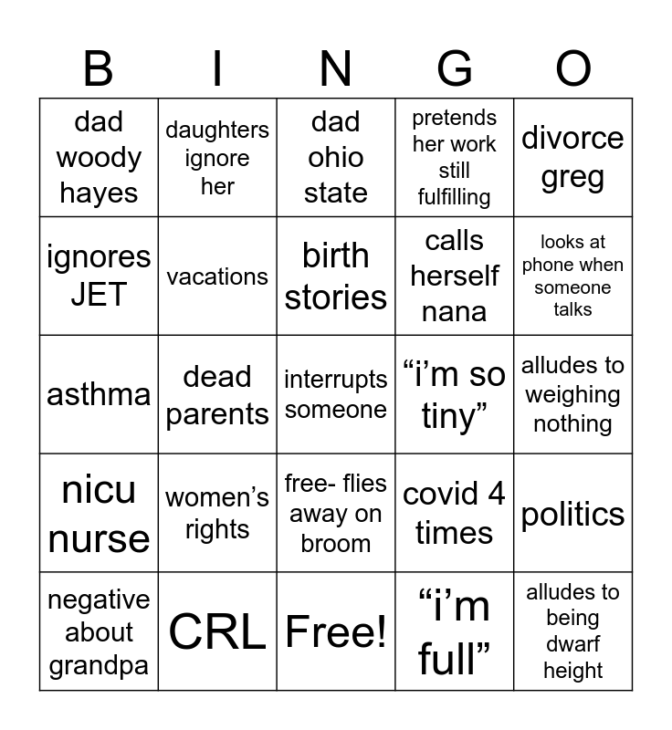 This bingo card has a free space and 31 words: Free!, dead mom, dead parents, dad football coach, dad woody hayes, dad ohio state, vacations, covid 4 times, “i’m so tiny”, “i’m full”, alludes to weighing nothing, alludes to being dwarf height, repeats what someone just said, talks about football stats, looks at phone when someone talks, contributes personal narrative, politics, women’s rights, nicu nurse, free- flies away on broom, divorce greg, negative about grandma, negative about grandpa, daughters ignore her, calls herself nana, ignores JET, pretends her work still fulfilling, asthma, CRL, birth stories and asks you about yourself.