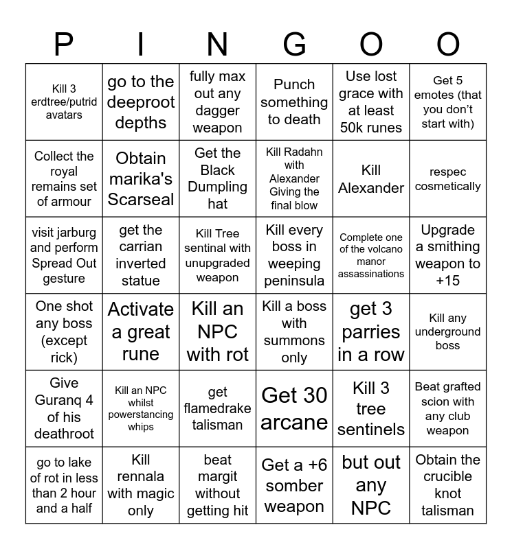 This bingo card has 36 words: Get 30 arcane, get flamedrake talisman, Get a +6 somber weapon, Collect the royal remains set of armour, One shot any boss (except rick), Kill every boss in weeping peninsula, Obtain marika's Scarseal, beat margit without getting hit, Use lost grace with at least 50k runes, Kill 3 tree sentinels, respec cosmetically, Punch something to death, Beat grafted scion with any club weapon, get the carrian inverted statue, Kill Radahn with Alexander Giving the final blow, Kill 3 erdtree/putrid avatars, Give Guranq 4 of his deathroot, Complete one of the volcano manor assassinations, visit jarburg and perform Spread Out gesture, fully max out any dagger weapon, Kill Tree sentinal with unupgraded weapon, Activate a great rune, Kill a boss with summons only, Kill an NPC with rot, get 3 parries in a row, go to the deeproot depths, Kill Alexander, Kill rennala with magic only, Get the Black Dumpling hat, Get 5 emotes (that you don’t start with), Obtain the crucible knot talisman, go to lake of rot in less than 2 hour and a half, Kill any underground boss, Upgrade a smithing weapon to +15, Kill an NPC whilst powerstancing whips and but out any NPC.