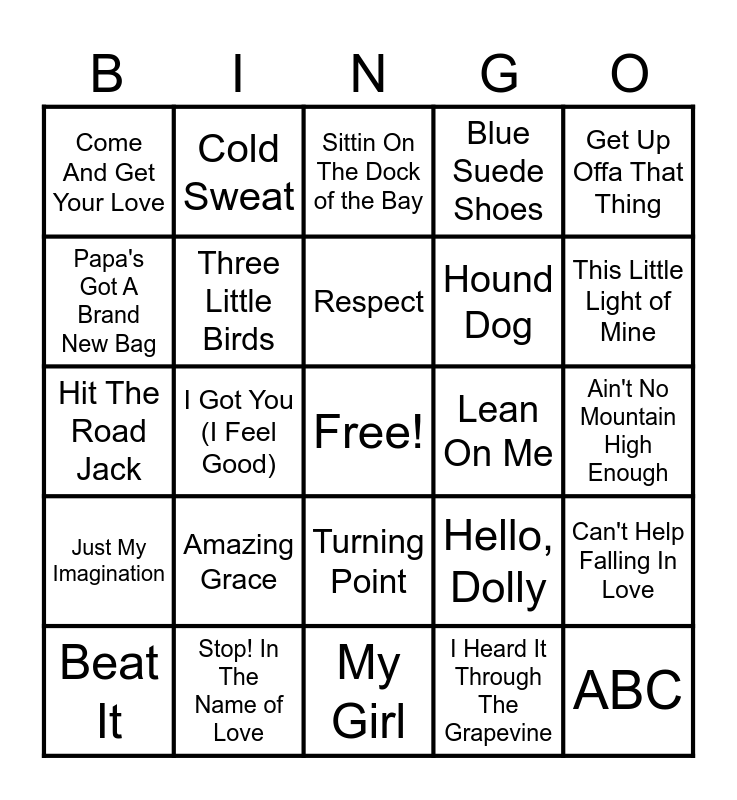 This bingo card has a free space and 26 words: Turning Point, I Heard It Through The Grapevine, Respect, Stop! In The Name of Love, Get Up Offa That Thing, Come And Get Your Love, Papa's Got A Brand New Bag, Cold Sweat, Ain't No Mountain High Enough, Hello, Dolly, Hound Dog, Hit The Road Jack, Can't Help Falling In Love, Beat It, I Got You (I Feel Good), Johnny B. Goode, Blue Suede Shoes, Just My Imagination, Sittin On The Dock of the Bay, ABC, This Little Light of Mine, My Girl, Lean On Me, Amazing Grace, Three Little Birds and Under the Boardwalk.
