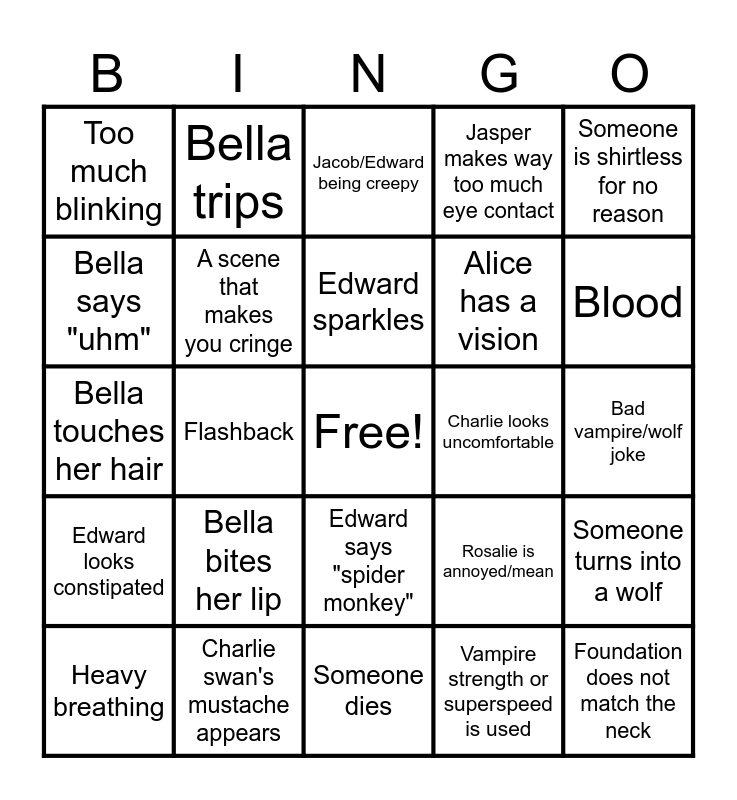 This bingo card has a free space and 24 words: Bella bites her lip, Charlie swan's mustache appears, Edward sparkles, Heavy breathing, Someone is shirtless for no reason, Too much blinking, Bella says "uhm", Bella trips, Charlie looks uncomfortable, Edward says "spider monkey", Alice has a vision, Bella touches her hair, Rosalie is annoyed/mean, Someone turns into a wolf, A scene that makes you cringe, Vampire strength or superspeed is used, Bad vampire/wolf joke, Jacob/Edward being creepy, Blood, Flashback, Foundation does not match the neck, Edward looks constipated, Jasper makes way too much eye contact and Someone dies.