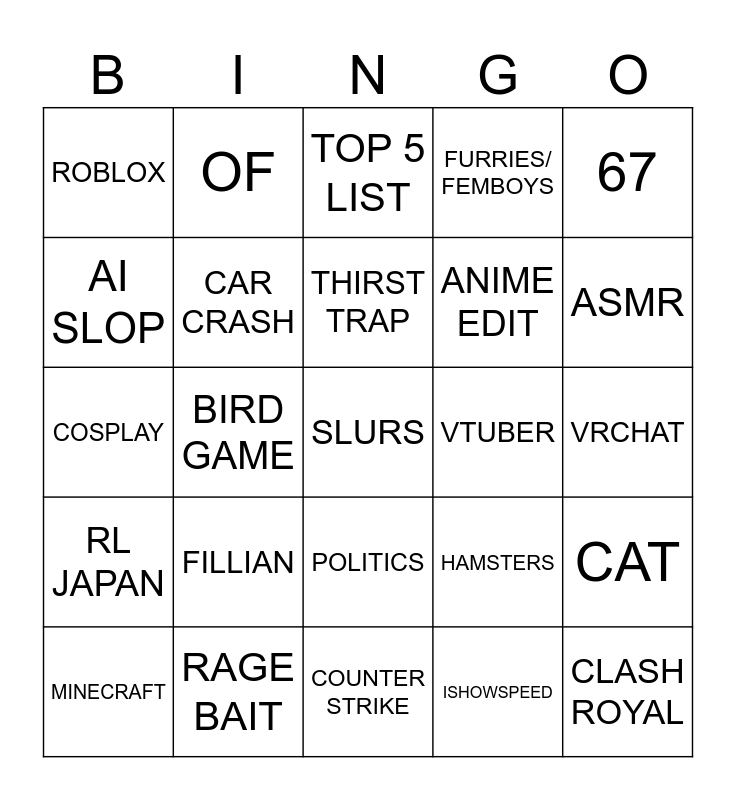This bingo card has a free space and 24 words: FILLIAN, RAGE BAIT, THIRST TRAP, MINECRAFT, 67, ROBLOX, AI SLOP, OF, VTUBER, POLITICS, ANIME EDIT, COSPLAY, HAMSTERS, CAT, CAR CRASH, ISHOWSPEED, VRCHAT, TOP 5 LIST, ASMR, BIRD GAME, CLASH ROYAL, RL JAPAN, FURRIES/ FEMBOYS and COUNTER STRIKE.