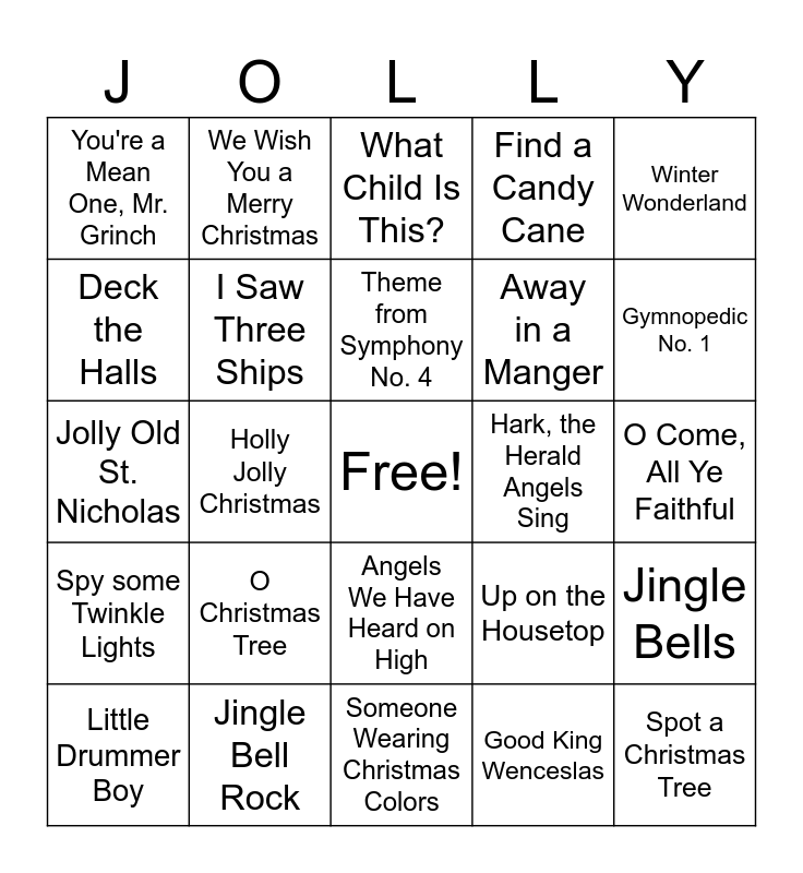 This bingo card has a free space and 24 words: O Christmas Tree, Jingle Bell Rock, Theme from Symphony No. 4, Little Drummer Boy, Winter Wonderland, You're a Mean One, Mr. Grinch, Deck the Halls, We Wish You a Merry Christmas, Hark, the Herald Angels Sing, Angels We Have Heard on High, Away in a Manger, Jolly Old St. Nicholas, Up on the Housetop, Jingle Bells, I Saw Three Ships, Good King Wenceslas, O Come, All Ye Faithful, What Child Is This?, Gymnopedic No. 1, Holly Jolly Christmas, Spot a Christmas Tree, Spy some Twinkle Lights, Find a Candy Cane and Someone Wearing Christmas Colors.