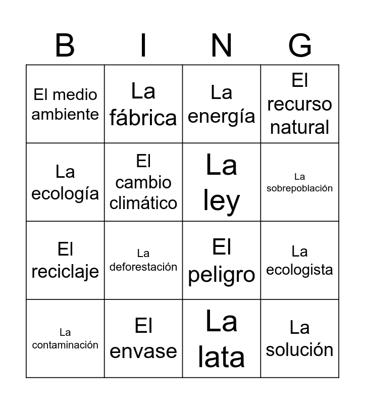 This bingo card has 21 words: El envase, La extinción, La fábrica, El gobierno, La lata, La ley, El medio ambiente, La energía, El peligro, La sobrepoblación, El reciclaje, El recurso natural, La solución, El ecoturismo, El cambio climático, La conservación, La contaminación, La deforestación, La ecología, La ecologista and El calentamiento global.