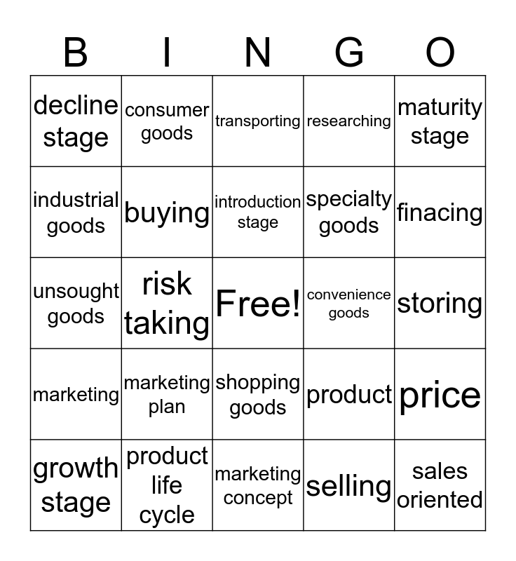 This bingo card has a free space and 24 words: marketing plan, product life cycle, introduction stage, growth stage, maturity stage, decline stage, industrial goods, consumer goods, convenience goods, shopping goods, specialty goods, unsought goods, product, price, buying, selling, storing, transporting, finacing, risk taking, sales oriented, marketing, researching and marketing concept.