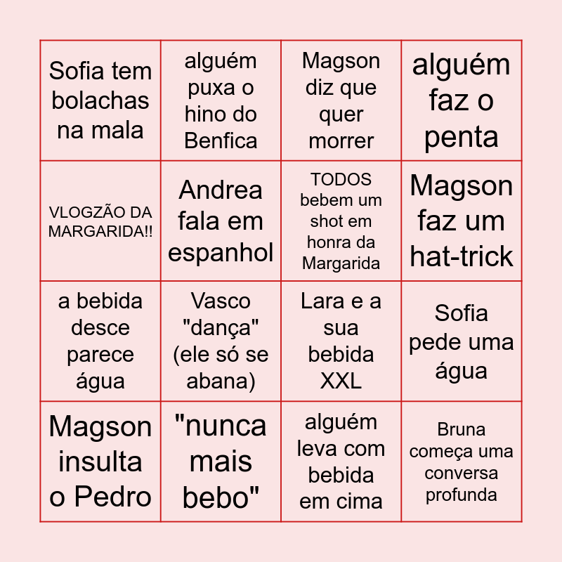 This bingo card has 24 words: conversa profunda do nada, "Yuna, quero-me ir embora", Magson faz um hat-trick, alguém desaparece durante 20 minutos, VLOGZÃO DA MARGARIDA!!, Sofia tem bolachas na mala, Andrea fala em espanhol, alguém puxa o hino do Benfica, "nunca mais bebo", alguém se esquece que o dress code é ALL BLACK, a bebida desce parece água, Lara e a sua bebida XXL, Yuna vira inimiga do fim, Pedro menciona a ex ou o Raivel, TODOS bebem um shot em honra da Margarida, Ariana tem de ir ao WC de hora em hora, alguém leva com bebida em cima, Magson diz que quer morrer, Vasco "dança" (ele só se abana), Sofia pede uma água, Magson insulta o Pedro, Bruna começa uma conversa profunda, alguém faz o penta and Ariana vira amiga do fim.