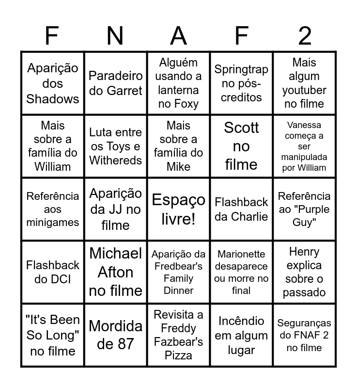 This bingo card has a free space and 24 words: Michael Afton no filme, Mordida de 87, Mais sobre a família do Mike, "It's Been So Long" no filme, Mais algum youtuber no filme, Aparição dos Shadows, Mais sobre a família do William, Paradeiro do Garret, Flashback da Charlie, Aparição da Fredbear's Family Dinner, Scott no filme, Referência aos minigames, Marionette desaparece ou morre no final, Henry explica sobre o passado, Luta entre os Toys e Withereds, Incêndio em algum lugar, Referência ao "Purple Guy", Alguém usando a lanterna no Foxy, Vanessa começa a ser manipulada por William, Aparição da JJ no filme, Seguranças do FNAF 2 no filme, Flashback do DCI, Springtrap no pós-creditos and Revisita a Freddy Fazbear's Pizza.
