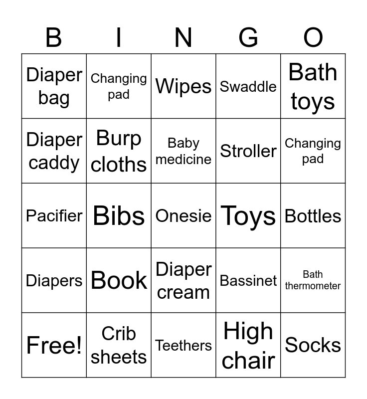 This bingo card has 29 words: Free!, Diaper genie, Bibs, Socks, Diaper bag, Wipes, Burp cloths, Book, Toys, Crib sheets, Bottles, Onesie, Teethers, High chair, Changing pad, Sound machine, Diaper cream, Diapers, Bath toys, Pacifier, Bassinet, Swaddle, Stroller, Diaper caddy, Swaddle, Changing pad, Bath thermometer, Baby medicine and Baby lotion.