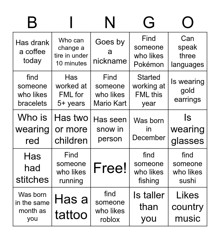 This bingo card has 35 words: Has been to three countries, Drives a Peterbilt, Has gotten a ticket in the last month, Started working at FML this year, Likes country music, Has drank a coffee today, Has worked at FML for 5+ years, Who was born before 1990, Was born in December, Has four or more siblings, Who is wearing red, Who can change a tire in under 10 minutes, Free!, Will blow up cohetes this Christmas, Can speak three languages, Has had stitches, Has a tattoo, Goes by a nickname, Is taller than you, Is wearing glasses, Was born in the same month as you, Has two or more children, Has seen snow in person, Has driven over Catracho, Is wearing gold earrings, find someone who likes bracelets, find someone who likes their tablet, find someone who likes roblox, find someone who likes fishing, find someone who likes sushi, Find someone who plays an instrument, Find someone who likes running, Find someone who likes Mario Kart, Find someone who likes Pokémon and Find someone who can cook.