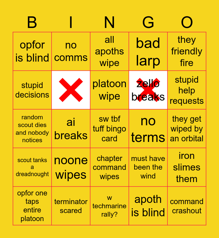 This bingo card has 3 images, a free space and 24 words: chapter command wipes, apoth is blind, platoon wipe, terminator scared, they friendly fire, opfor is blind, stupid decisions, no comms, they get wiped by an orbital, must have been the wind, zello breaks, random scout dies and nobody notices, iron slimes them, opfor one taps entire platoon, ai breaks, zeus leaves mid op, bad larp, scout tanks a dreadnought, all apoths wipe, command crashout, stupid help requests, w techmarine rally?, no terms and noone wipes.