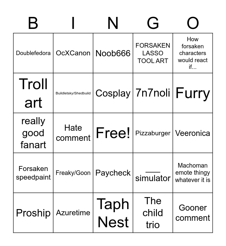 This bingo card has a free space and 24 words: Freaky/Goon, Azuretime, Cosplay, Proship, How forsaken characters would react if..., Doublefedora, Troll art, OcXCanon, Pizzaburger, Paycheck, 7n7noli, really good fanart, ___ simulator, Machoman emote thingy whatever it is, Buildletsky/Shedbuild, The child trio, Veeronica, Noob666, Furry, Hate comment, Gooner comment, Forsaken speedpaint, FORSAKEN LASSO TOOL ART and Taph Nest.
