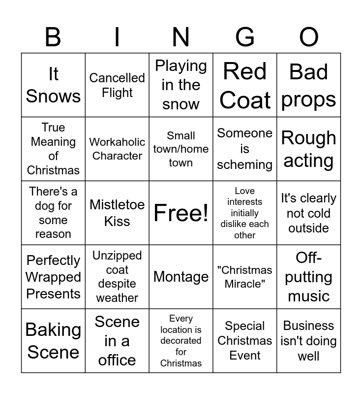 This bingo card has a free space and 35 words: This is just in a house, Someone hates Christmas, Plaid, Workaholic Character, Montage, Red Coat, True Meaning of Christmas, Competition or Contest, Small town/home town, awkward silence, There's a dog for some reason, Bad props, Christmas Sweaters, Dead Parent, It Snows, Love interests initially dislike each other, Special Christmas Event, Mistletoe Kiss, Perfectly Wrapped Presents, Business isn't doing well, "Christmas Miracle", Baking Scene, Off- putting music, Scene in a office, Playing in the snow, Rough acting, Best Friend Character, Family Business, Someone is scheming, It's clearly not cold outside, Hot Cocoa or Eggnog, Every location is decorated for Christmas, Unzipped coat despite weather, Cancelled Flight and Drivin' a truck.