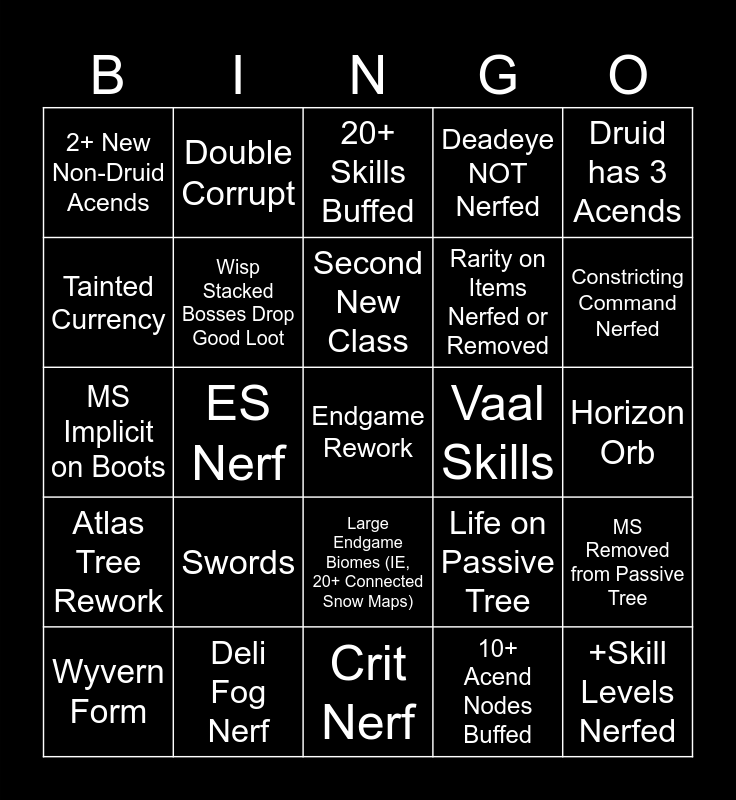 This bingo card has a free space and 24 words: Swords, Deli Fog Nerf, Second New Class, Wyvern Form, Druid has 3 Acends, 2+ New Non-Druid Acends, Tainted Currency, Double Corrupt, Vaal Skills, Large Endgame Biomes (IE, 20+ Connected Snow Maps), Rarity on Items Nerfed or Removed, MS Implicit on Boots, Life on Passive Tree, MS Removed from Passive Tree, Wisp Stacked Bosses Drop Good Loot, 10+ Acend Nodes Buffed, Horizon Orb, 20+ Skills Buffed, Constricting Command Nerfed, ES Nerf, +Skill Levels Nerfed, Atlas Tree Rework, Deadeye NOT Nerfed and Crit Nerf.