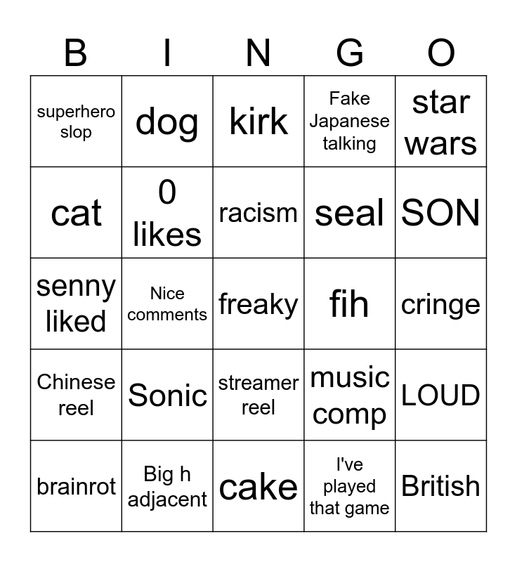 This bingo card has a free space and 24 words: Sonic, Big h adjacent, racism, brainrot, star wars, superhero slop, cat, dog, fih, streamer reel, seal, senny liked, music comp, LOUD, 0 likes, I've played that game, cringe, kirk, SON, Nice comments, British, Chinese reel, Fake Japanese talking and cake.
