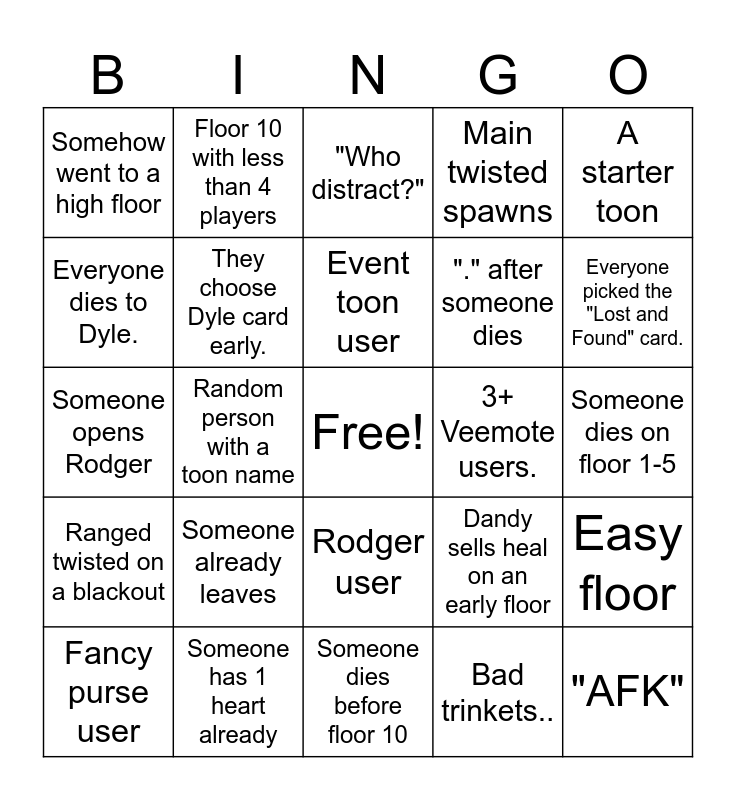 This bingo card has a free space and 24 words: Fancy purse user, Someone already leaves, Event toon user, Bad trinkets.., A starter toon, Somehow went to a high floor, Floor 10 with less than 4 players, "Who distract?", 3+ Veemote users., Someone dies on floor 1-5, Someone opens Rodger, They choose Dyle card early., Dandy sells heal on an early floor, Easy floor, Everyone dies to Dyle., Someone has 1 heart already, Someone dies before floor 10, Main twisted spawns, Everyone picked the "Lost and Found" card., Ranged twisted on a blackout, Random person with a toon name, Rodger user, "." after someone dies and "AFK".