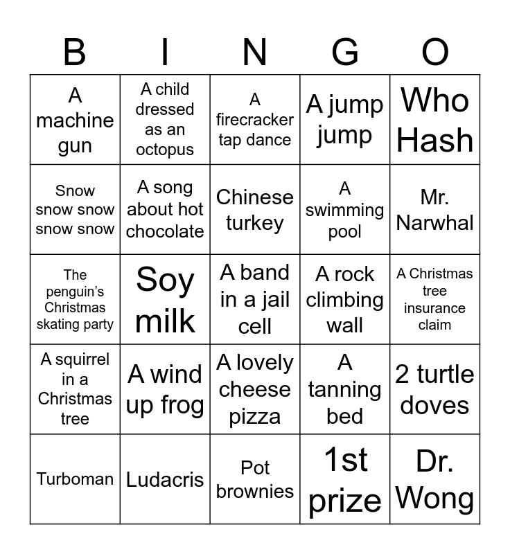 This bingo card has 25 words: A wind up frog, Pot brownies, Chinese turkey, Turboman, Who Hash, A machine gun, Snow snow snow snow snow, A child dressed as an octopus, A rock climbing wall, A lovely cheese pizza, A swimming pool, The penguin’s Christmas skating party, A tanning bed, 2 turtle doves, A song about hot chocolate, Dr. Wong, A Christmas tree insurance claim, A firecracker tap dance, Mr. Narwhal, Soy milk, A band in a jail cell, Ludacris, A squirrel in a Christmas tree, A jump jump and 1st prize.