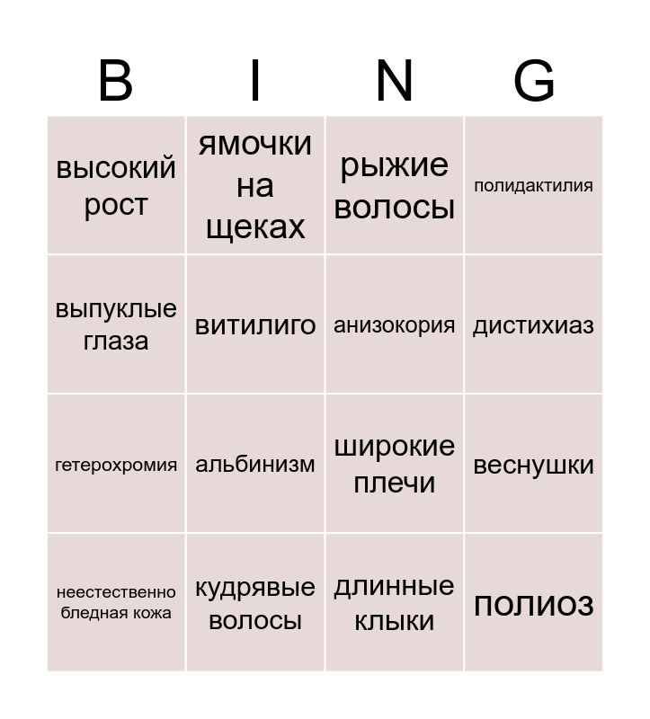 This bingo card has 16 words: кудрявые волосы, веснушки, рыжие волосы, высокий рост, гетерохромия, ямочки на щеках, широкие плечи, длинные клыки, выпуклые глаза, витилиго, неестественно бледная кожа, полидактилия, альбинизм, дистихиаз, анизокория and полиоз.