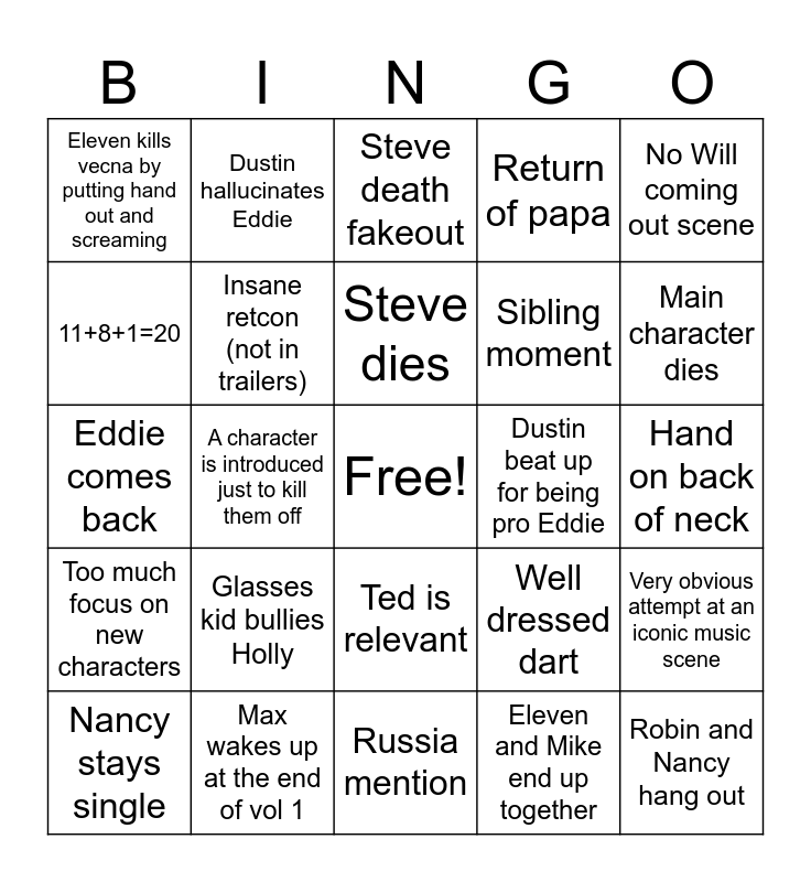 This bingo card has a free space and 24 words: Glasses kid bullies Holly, Max wakes up at the end of vol 1, Steve dies, Nancy stays single, No Will coming out scene, Eleven kills vecna by putting hand out and screaming, 11+8+1=20, Dustin hallucinates Eddie, Dustin beat up for being pro Eddie, Ted is relevant, Sibling moment, Eddie comes back, Well dressed dart, Very obvious attempt at an iconic music scene, Insane retcon (not in trailers), Eleven and Mike end up together, Hand on back of neck, Steve death fakeout, Main character dies, A character is introduced just to kill them off, Robin and Nancy hang out, Too much focus on new characters, Return of papa and Russia mention.