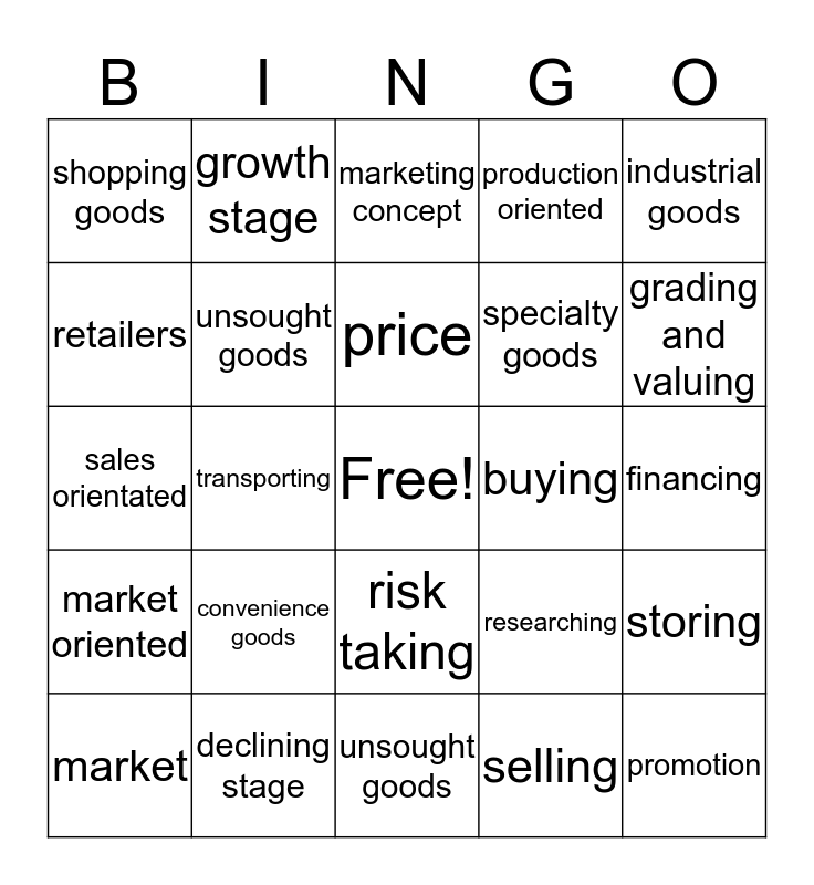 This bingo card has a free space and 24 words: convenience goods, declining stage, price, market, industrial goods, shopping goods, retailers, growth stage, buying, risk taking, specialty goods, sales orientated, researching, storing, unsought goods, selling, financing, marketing concept, grading and valuing, transporting, promotion, market oriented, production oriented and unsought goods.