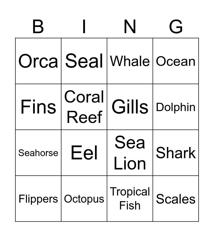 This bingo card has 16 words: Octopus, Shark, Whale, Orca, Seahorse, Seal, Sea Lion, Tropical Fish, Fins, Coral Reef, Flippers, Ocean, Eel, Dolphin, Gills and Scales.
