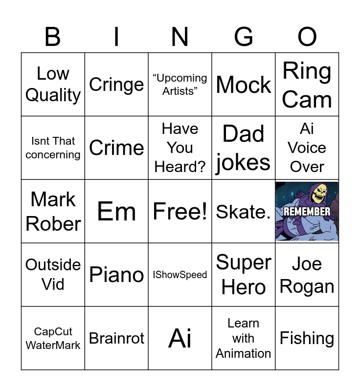 This bingo card has 1 images, a free space and 23 words: Piano, Brainrot, Have You Heard?, CapCut WaterMark, Ring Cam, Low Quality, Isnt That concerning, Cringe, Skate., IShowSpeed, Dad jokes, Mark Rober, Super Hero, Joe Rogan, Crime, Learn with Animation, βUpcoming Artistsβ, Ai Voice Over, Em, Fishing, Outside Vid, Mock and Ai.