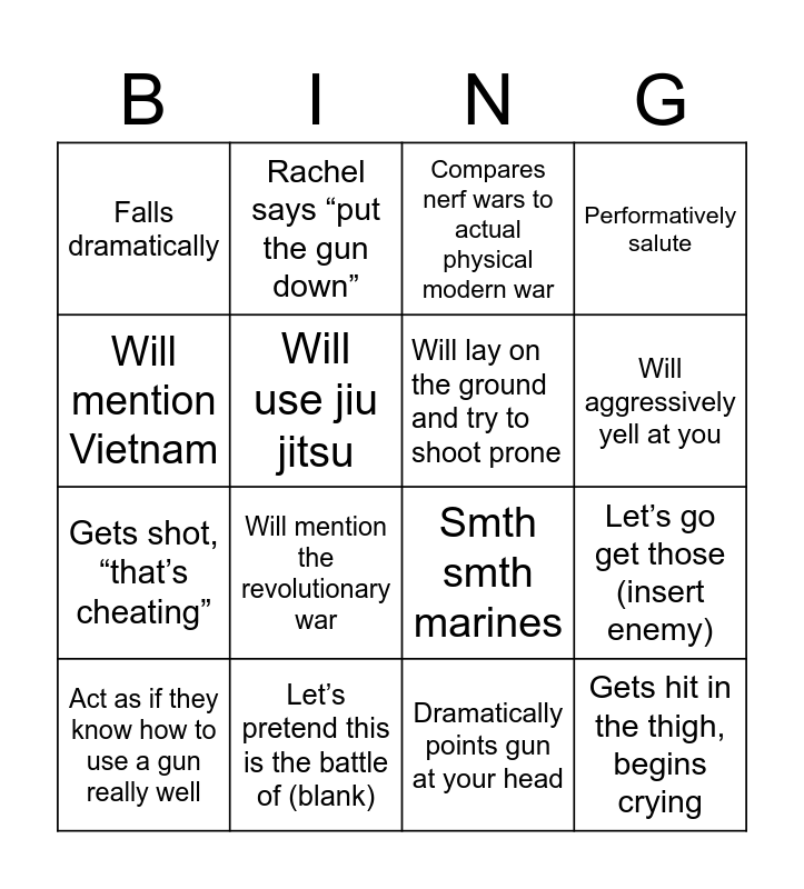 This bingo card has 16 words: Let’s pretend this is the battle of (blank), Let’s go get those (insert enemy), Compares nerf wars to actual physical modern war, Falls dramatically, Gets shot, “that’s cheating”, Rachel says “put the gun down”, Smth smth marines, Dramatically points gun at your head, Will mention Vietnam, Will use jiu jitsu, Act as if they know how to use a gun really well, Performatively salute, Will mention the revolutionary war, Will aggressively yell at you, Will lay on the ground and try to shoot prone and Gets hit in the thigh, begins crying.