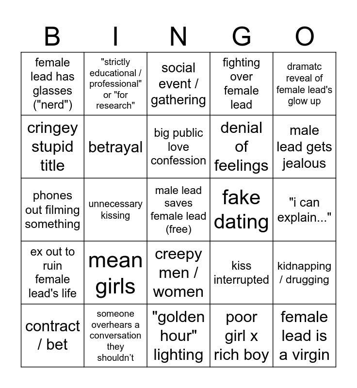 This bingo card has a free space and 29 words: contract / bet, sad backstory (male lead), unnecessary kissing, male lead is SHIRTLESS, female lead has glasses ("nerd"), social event / gathering, betrayal, mean girls, fake dating, someone overhears a conversation they shouldn’t, "i can explain...", female lead is a virgin, "golden hour" lighting, poor girl x rich boy, male lead gets jealous, "accidentally" spilling something on someone, creepy men / women, ex out to ruin female lead's life, dramatc reveal of female lead's glow up, phones out filming something, kiss interrupted, brother's rival/best friend, denial of feelings, cringey stupid title, fighting over female lead, "strictly educational / professional" or "for research", kidnapping / drugging, big public love confession and rumour spread.