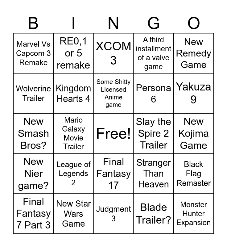 This bingo card has a free space and 39 words: Balatro 1.1, Fromsoft game that isn't Duskbloods, Silent Hill 3 Remake, Kingdom Hearts 4, Final Fantasy 7 Part 3, Final Fantasy 17, Some Shitty Licensed Anime game, Crazy Fortnite Collab, New Remedy Game, New Nier game?, Mario Galaxy Movie Trailer, A third installment of a valve game, Monster Hunter Expansion, New Kojima Game, Slay the Spire 2 Trailer, League of Legends 2, New Mortal Kombat Game, Marvel Vs Capcom 3 Remake, Mass Effect 4 Anything, Stranger Than Heaven, Wolverine Trailer, Judgment 3, Persona 6, Yakuza 9, New Wolfenstein Game, Splinter Cell Remake, Tides of Annihilation Trailer, Silent Hill 1 Remake, Witcher 4 Trailer, RE0,1 or 5 remake, New God of War, DMC remake?, XCOM 3, New Star Wars Game, Blade Trailer?, Tomb Raider, Black Flag Remaster, New Smash Bros? and Expedition DLC.