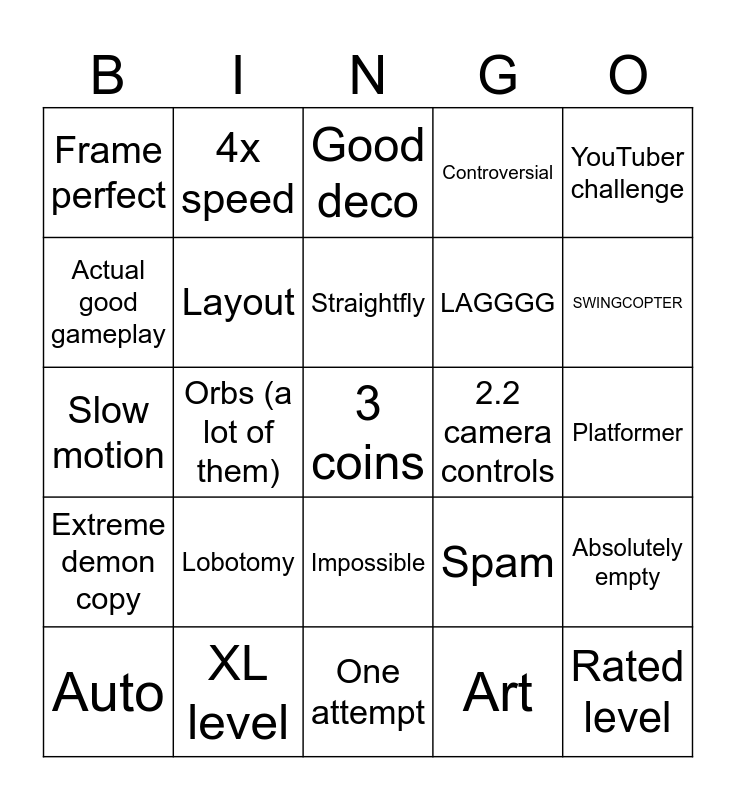This bingo card has a free space and 24 words: Lobotomy, XL level, Straightfly, Auto, YouTuber challenge, Frame perfect, Actual good gameplay, 4x speed, 2.2 camera controls, Impossible, LAGGGG, Slow motion, Spam, Absolutely empty, Layout, Art, Platformer, Good deco, SWINGCOPTER, Orbs (a lot of them), Rated level, Extreme demon copy, Controversial and One attempt.