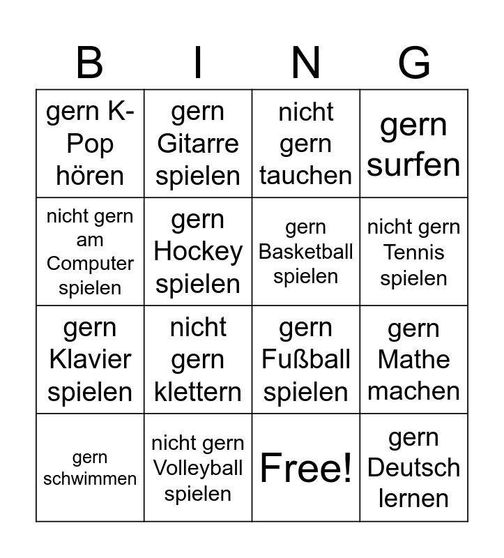 This bingo card has 17 words: Free!, gern schwimmen, nicht gern tauchen, gern K-Pop hören, nicht gern klettern, gern surfen, gern Mathe machen, gern Basketball spielen, nicht gern Tennis spielen, gern Hockey spielen, nicht gern Volleyball spielen, gern Fußball spielen, nicht gern am Computer spielen, gern Gitarre spielen, gern Klavier spielen, nicht gern Karate machen and gern Deutsch lernen.