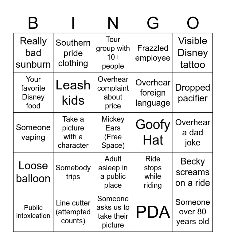 This bingo card has a free space and 34 words: Socks with sandals, PDA, Public meltdown, Dropped snack, Loose balloon, Leash kids, Visible Disney tattoo, Public intoxication, Southern pride clothing, Wild duck, Overhear complaint about price, Tour group with 10+ people, Under 5 years old in a princess outfit, Scared child on ride, Goofy Hat, Dropped pacifier, Line cutter (attempted counts), Someone vaping, Somebody trips, Ride stops while riding, Adult asleep in a public place, Three-seat or more stroller, Really bad sunburn, Overhear a dad joke, Someone asks us to take their picture, Someone over 80 years old, Frazzled employee, Receive a compliment, Overhear foreign language, Your favorite Disney food, Parade!, Take a picture with a character, Becky screams on a ride and What movie is that from?.