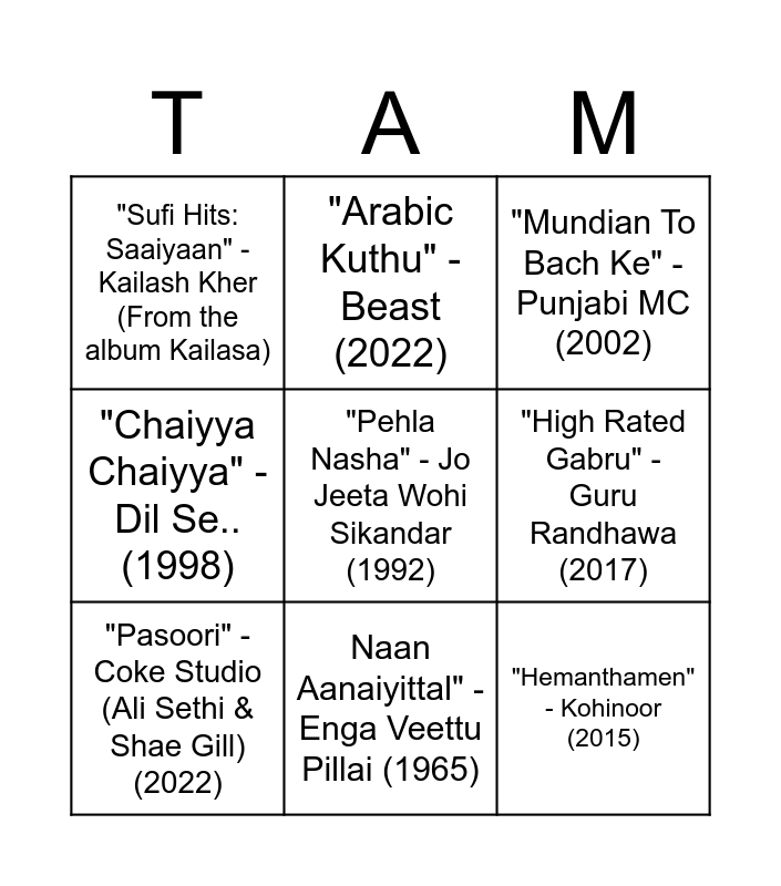 This bingo card has 50 words: "Laga Chunari Mein Daag" - Dil Hi Toh Hai (1963), "Kora Kagaz Tha Yeh Man Mera" - Aradhana (1969), "Chalte Chalte" - Pakeezah (1972), "Kabhi Kabhie Mere Dil Mein" - Kabhie Kabhie (1976), "Dil Deewana" - Maine Pyar Kiya (1989), "Tujhe Dekha Toh Yeh Jaana Sanam" - Dilwale Dulhania Le Jayenge (1995), "Chaiyya Chaiyya" - Dil Se.. (1998), "Kal Ho Naa Ho" - Kal Ho Naa Ho (2003), "Pehla Nasha" - Jo Jeeta Wohi Sikandar (1992), "Tum Hi Ho" - Aashiqui 2 (2013), Naan Aanaiyittal" - Enga Veettu Pillai (1965), "Poo Vaasam Purappadum" - Anbe Vaa (1966), "Sundari Kannal Oru Seithi" - Dalapathi (1991), "Thendral Vandhu Theendumbothu" - Avatharam (1995), "Kaadhal Rojave" - Roja (1992), "Vennilave Vennilave" - Minsara Kanavu (1997), "Mudhalvane" - Mudhalvan (1999), "Kandaangi Kandaangi" - Jilla (2014), "Rowdy Baby" - Maari 2 (2018), "Arabic Kuthu" - Beast (2022), Challa" - Challa (Gurdas Maan classic), "Dil Le Gayi Kudi Gujarat Di" - Jassi (1999), "Sufi Hits: Saaiyaan" - Kailash Kher (From the album Kailasa), "Mundian To Bach Ke" - Punjabi MC (2002), "Do Ghoont" - Gippy Grewal (2018), "Lahore" - Guru Randhawa (2018), "High Rated Gabru" - Guru Randhawa (2017), "Brown Munde" - AP Dhillon (2020), "Pasoori" - Coke Studio (Ali Sethi & Shae Gill) (2022), "So High" - Sidhu Moose Wala (2018), Emi Setuuraa Lingaa" - Devadasu (1953), "Aakaasa Veedhilo" - Naa Autograph (2004), "Bommali" - Billa (2009), "Anandamaaye" - Godavari (2006), "Dhimmathirigae" - Srimanthudu (2015), "Vachinde" - Fidaa (2017), "O Antava Ooo Antava" - Pushpa: The Rise (2021), "Butta Bomma" - Ala Vaikunthapurramuloo (2020), "Naatu Naatu" - RRR (2022) - Oscar Winner, "Kurchi Madathapetti" - Guntur Kaaram (2024), Manjalayil Mungi Thorthi" - Kanyaka (1966), "Ezhu Sundara Rathrikal" - Chattambi Kalyani (1975), "Devadoothar Paadi" - Kattathe Kilikoodu (1983), "Oru Murai Vanthu Parthaya" - Manichitrathazhu (1993), "Aararo Ariraro" - Kizhakkunarum Pakshi (1991), "Hemanthamen" - Kohinoor (2015), "Pazham Thamizh Paattizhayum" - Manjil Virinja Pookkal (1980), "Thaniye Mizhikal" - Guppy (2016), "Jimikki Kammal" - Velipadinte Pusthakam (2017) and "Ennile Chudurola" - Anugraheethan Antony (2020).