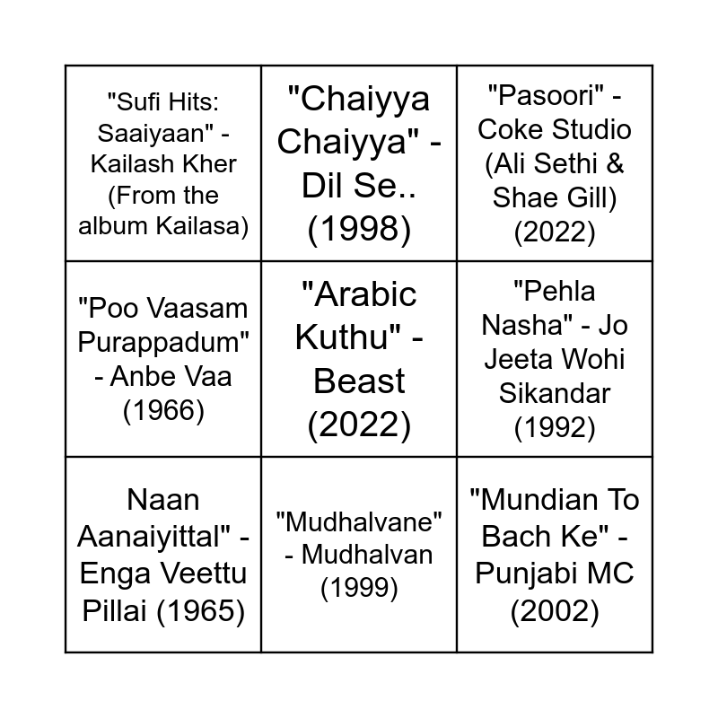 This bingo card has 50 words: "Laga Chunari Mein Daag" - Dil Hi Toh Hai (1963), "Kora Kagaz Tha Yeh Man Mera" - Aradhana (1969), "Chalte Chalte" - Pakeezah (1972), "Kabhi Kabhie Mere Dil Mein" - Kabhie Kabhie (1976), "Dil Deewana" - Maine Pyar Kiya (1989), "Tujhe Dekha Toh Yeh Jaana Sanam" - Dilwale Dulhania Le Jayenge (1995), "Chaiyya Chaiyya" - Dil Se.. (1998), "Kal Ho Naa Ho" - Kal Ho Naa Ho (2003), "Pehla Nasha" - Jo Jeeta Wohi Sikandar (1992), "Tum Hi Ho" - Aashiqui 2 (2013), Naan Aanaiyittal" - Enga Veettu Pillai (1965), "Poo Vaasam Purappadum" - Anbe Vaa (1966), "Sundari Kannal Oru Seithi" - Dalapathi (1991), "Thendral Vandhu Theendumbothu" - Avatharam (1995), "Kaadhal Rojave" - Roja (1992), "Vennilave Vennilave" - Minsara Kanavu (1997), "Mudhalvane" - Mudhalvan (1999), "Kandaangi Kandaangi" - Jilla (2014), "Rowdy Baby" - Maari 2 (2018), "Arabic Kuthu" - Beast (2022), Challa" - Challa (Gurdas Maan classic), "Dil Le Gayi Kudi Gujarat Di" - Jassi (1999), "Sufi Hits: Saaiyaan" - Kailash Kher (From the album Kailasa), "Mundian To Bach Ke" - Punjabi MC (2002), "Do Ghoont" - Gippy Grewal (2018), "Lahore" - Guru Randhawa (2018), "High Rated Gabru" - Guru Randhawa (2017), "Brown Munde" - AP Dhillon (2020), "Pasoori" - Coke Studio (Ali Sethi & Shae Gill) (2022), "So High" - Sidhu Moose Wala (2018), Emi Setuuraa Lingaa" - Devadasu (1953), "Aakaasa Veedhilo" - Naa Autograph (2004), "Bommali" - Billa (2009), "Anandamaaye" - Godavari (2006), "Dhimmathirigae" - Srimanthudu (2015), "Vachinde" - Fidaa (2017), "O Antava Ooo Antava" - Pushpa: The Rise (2021), "Butta Bomma" - Ala Vaikunthapurramuloo (2020), "Naatu Naatu" - RRR (2022) - Oscar Winner, "Kurchi Madathapetti" - Guntur Kaaram (2024), Manjalayil Mungi Thorthi" - Kanyaka (1966), "Ezhu Sundara Rathrikal" - Chattambi Kalyani (1975), "Devadoothar Paadi" - Kattathe Kilikoodu (1983), "Oru Murai Vanthu Parthaya" - Manichitrathazhu (1993), "Aararo Ariraro" - Kizhakkunarum Pakshi (1991), "Hemanthamen" - Kohinoor (2015), "Pazham Thamizh Paattizhayum" - Manjil Virinja Pookkal (1980), "Thaniye Mizhikal" - Guppy (2016), "Jimikki Kammal" - Velipadinte Pusthakam (2017) and "Ennile Chudurola" - Anugraheethan Antony (2020).