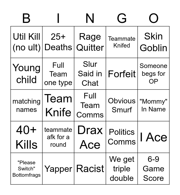 This bingo card has a free space and 24 words: teammate afk for a round, Yapper, Slur Said in Chat, "Please Switch" Bottomfrags, Skin Goblin, Util Kill (no ult), Young child, 25+ Deaths, Obvious Smurf, Drax Ace, Forfeit, matching names, Politics Comms, I Ace, Full Team one type, We get triple double, "Mommy" In Name, Rage Quitter, Someone begs for OP, Team Knife, 6-9 Game Score, 40+ Kills, Teammate Knifed and Racist.