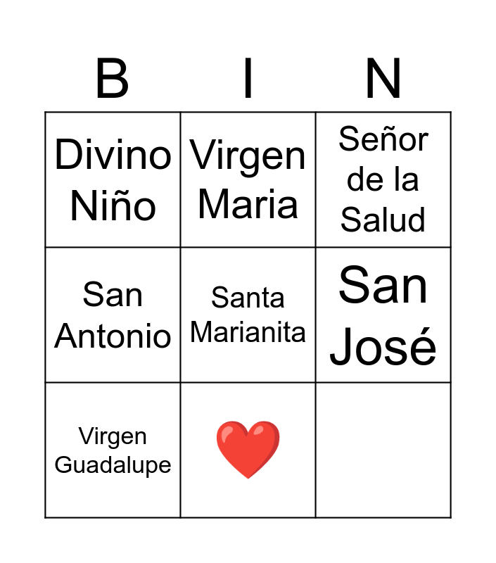 This bingo card has 9 words: ❤️, San Antonio, Virgen Maria, Señor de la Salud, Divino Niño, Santa Marianita, San José, Virgen Guadalupe and Arcángel San Miguel.