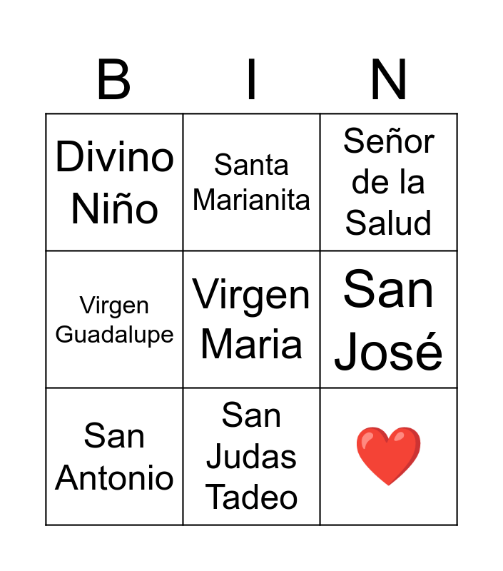This bingo card has 9 words: San Antonio, Virgen Maria, Señor de la Salud, Divino Niño, Santa Marianita, San José, Virgen Guadalupe, San Judas Tadeo and ❤️.