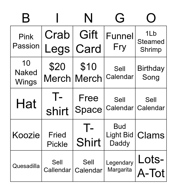 This bingo card has a free space and 24 words: Fried Pickle, Sell Callendar, $10 Merch, Quesadilla, 1Lb Steamed Shrimp, Pink Passion, 10 Naked Wings, Crab Legs, Sell Calendar, T-Shirt, Sell Calendar, Hat, Bud Light Bid Daddy, Clams, $20 Merch, Legendary Margarita, Sell Calendar, Gift Card, Birthday Song, T-shirt, Lots-A-Tot, Koozie, Funnel Fry and Sell Calendar.