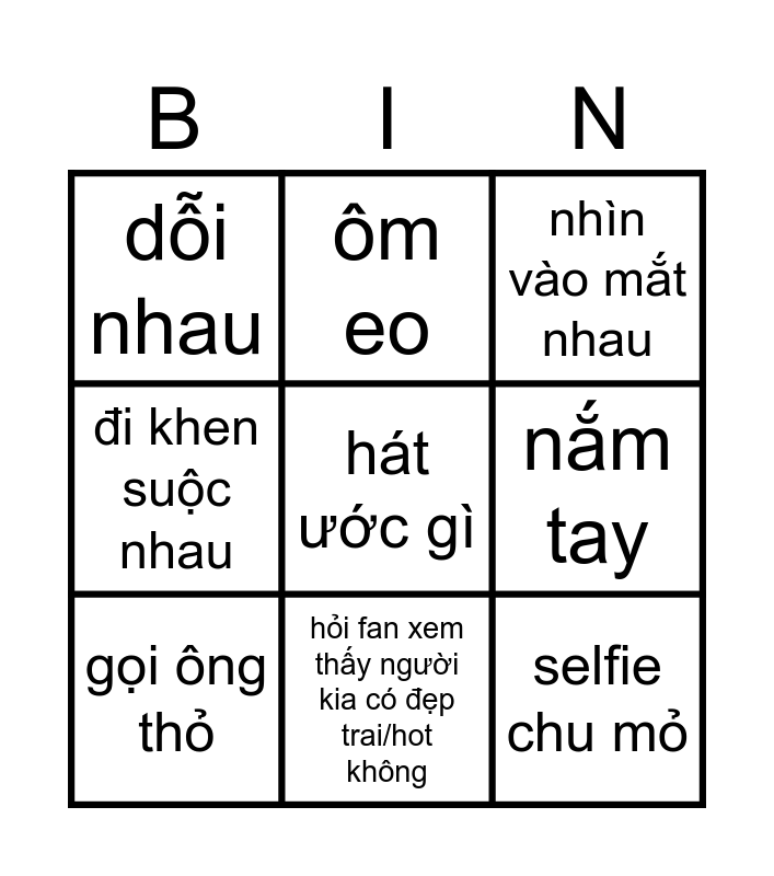 This bingo card has a free space and 8 words: nắm tay, nhìn vào mắt nhau, ôm eo, gọi ông thỏ, dỗi nhau, selfie chu mỏ, đi khen suộc nhau and hỏi fan xem thấy người kia có đẹp trai/hot không.