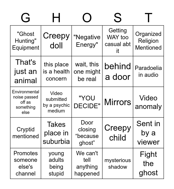 This bingo card has a free space and 61 words: secondhand video footage, young adults being stupid, Someone swears, Cryptid mentioned, mysterious shadow, run away shaky cam, this place is a health concern, "I'm a psychic", behind a door, Pet doing smth weird, Getting WAY too casual abt it, House too haunted, pack up and leave, That's just an animal, Hospital or Asylum, "I'm a skeptic", "Ghost Hunting" Equipment, Fight the ghost, Organized Religion Mentioned, Teenagers psych themselves out, wait, this one might be real, Mirrors, "Negative Energy", Promotes someone else's channel, Sent in by a viewer, Child talks to something, Pareidolia Voice, Electrical Disturbance, It's a tourist attraction, Paradoelia in audio, it's just a draft, 480p video, JUMPSCARE, String scare, Low ambient droning noise, Creepy doll, “Hello?”, Scary doll, Video submitted by a psychic medium, Ghost Hunter YouTubers, Environmental noise passed off as something else, “I am speaking to the spirit—“, Takes place in suburbia, Video anomaly, Funny child, Creepy child, Night vision camera, FLIR camera, Incoherent yelling, “OH MY GOD!!!”, Door closing “because ghost”, We can't tell anything happened, The B-Roll is scarier, Obvious Hoax, Hotel, Former murder site, MASSACHUSETTS, This was debunked already, Scare chords, World War 2, guardian angel and reddit.